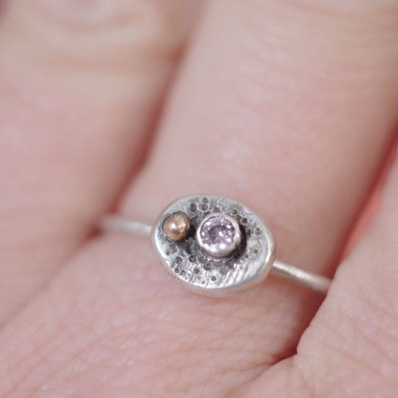 Orb ring Introducing our handmade light pink AAA cubic zirconia & 14k Gold filled ball Orb ring, with a polished Sterling Silver shank. Designed & crafted in our South Island studio, the organic design showcases a uniquely shaped and textured silver blob, melted and oxidised to enhance its rich, earthy aesthetic. Because we do not…