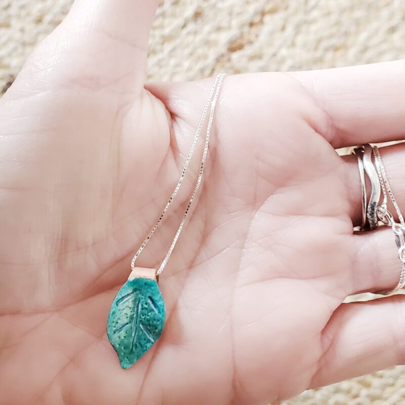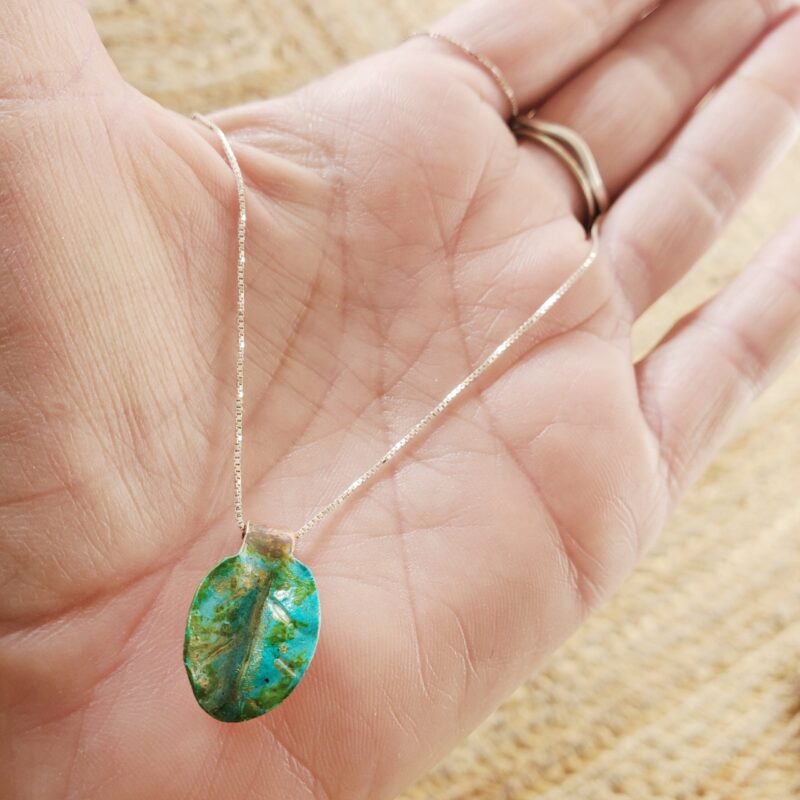 Hand-forged copper leaf, around 2 to 3 cm long. Hand-painted and sealed with a Sterling silver cable chain. The silver chain is mid-long, 56cm lenght. Avoid prolonged contact with water. Do not rub the leaf with a sharp or abrasive object to preserve the patina.
