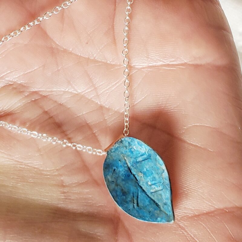 Hand-forged copper leaf, around 2 to 3 cm long. Hand-painted and sealed with a Sterling silver chain. The silver chain is short, 40cm lenght with a 3.5cm extension. Avoid prolonged contact with water. Do not rub the leaf with a sharp or abrasive object to preserve the patina.