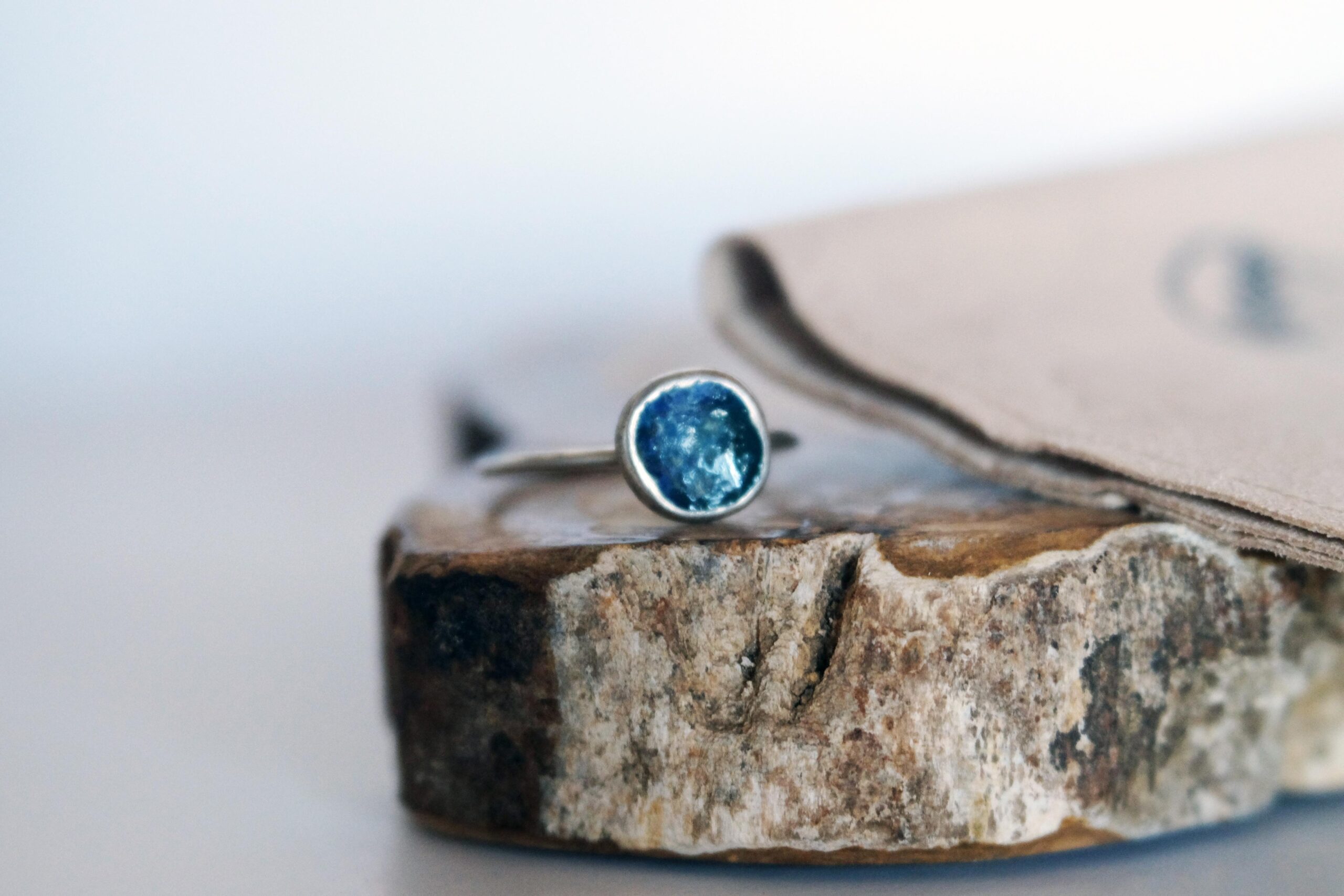 This delicate sterling silver cup ring holds layers of deep blue enamel, fired and fused to create a rich, almost mineral surface. The enamel reveals subtle crystalline textures and natural variations, catching the light like water over stone.